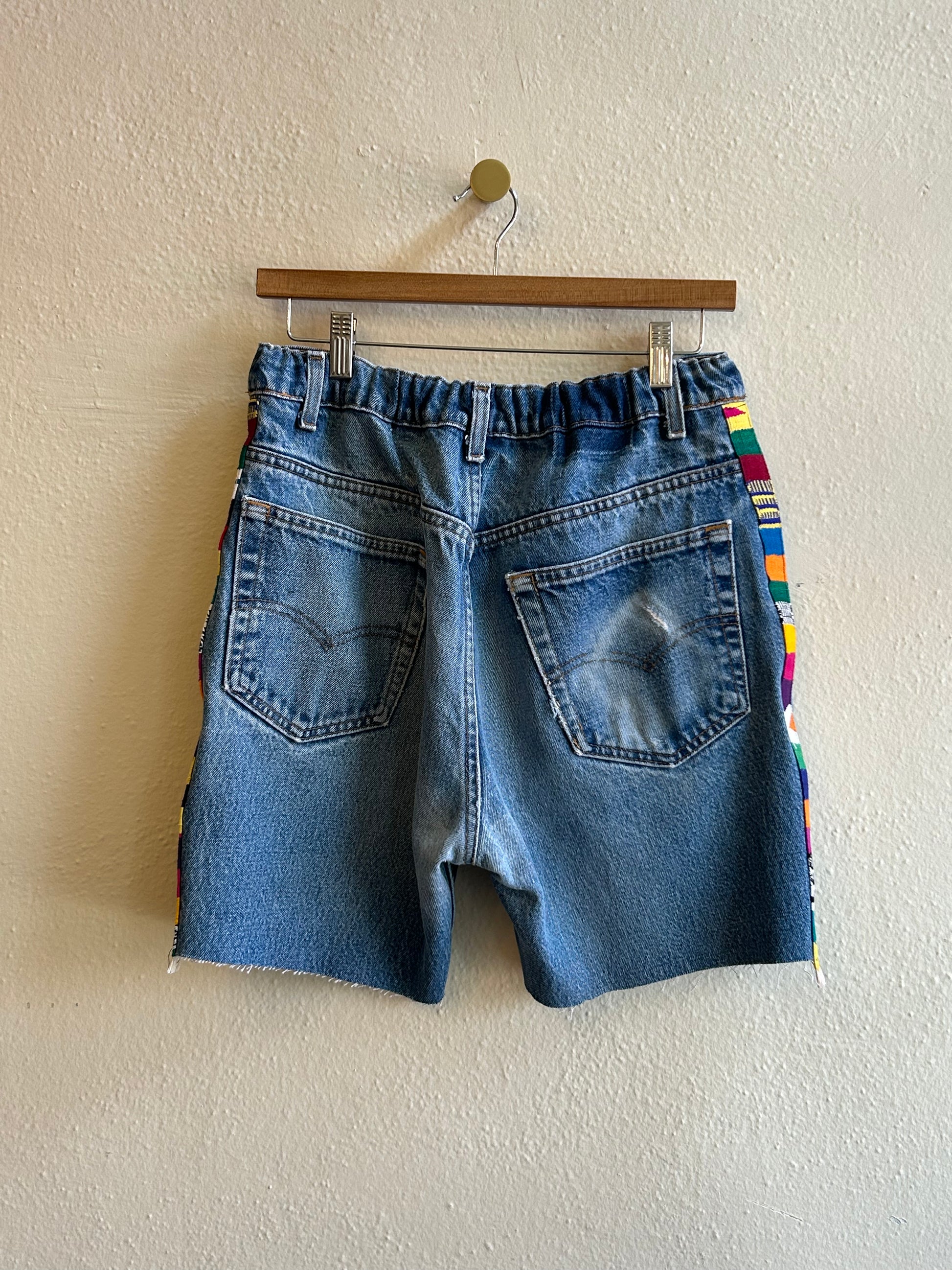 Super fun Levi's cut-offs with beautiful Mexican trim work down the side and elastic back waistband for flexible fit.