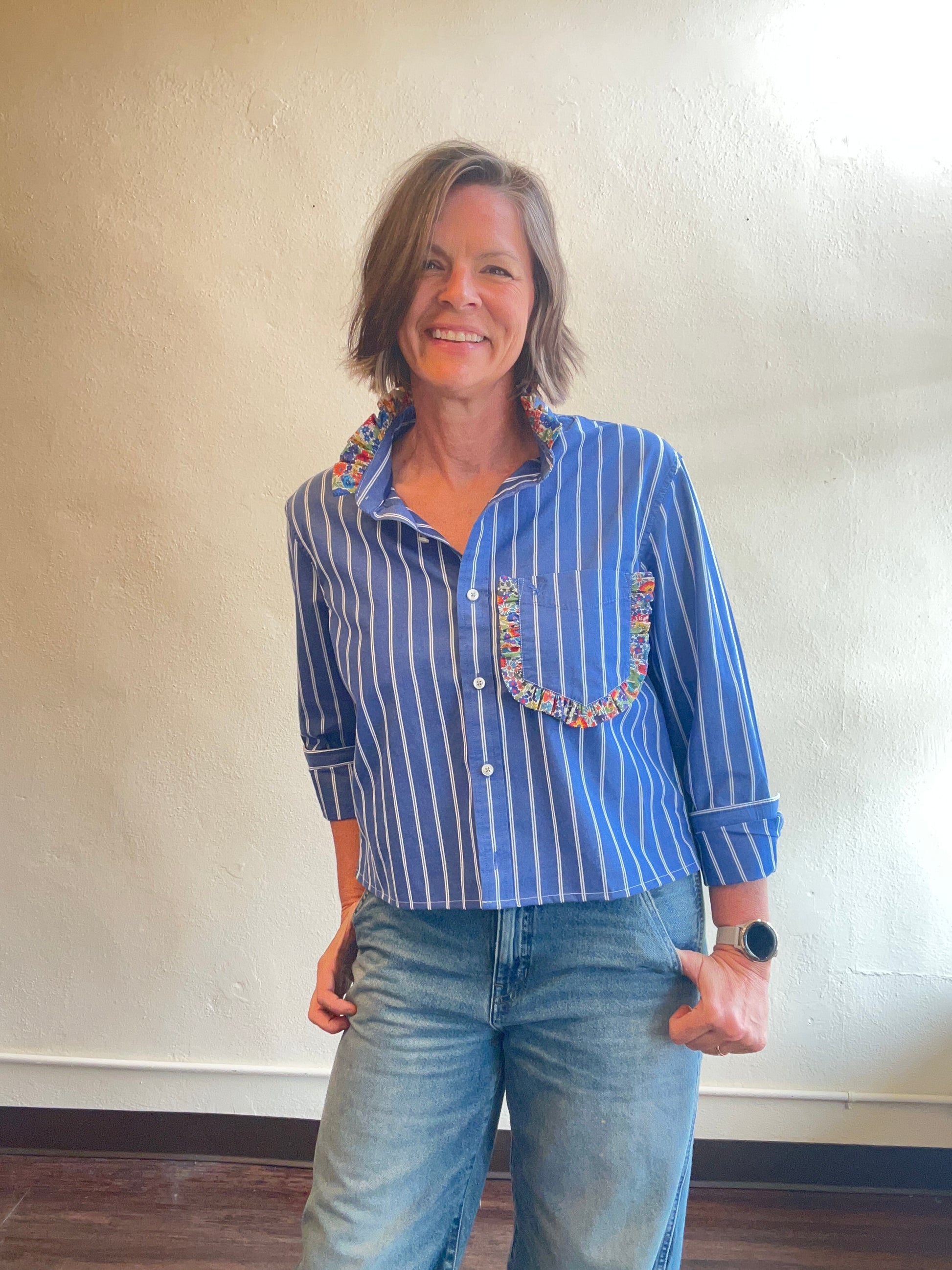Classic blue stripped, cropped button up with custom Liberty of London ruffle collar and pocket