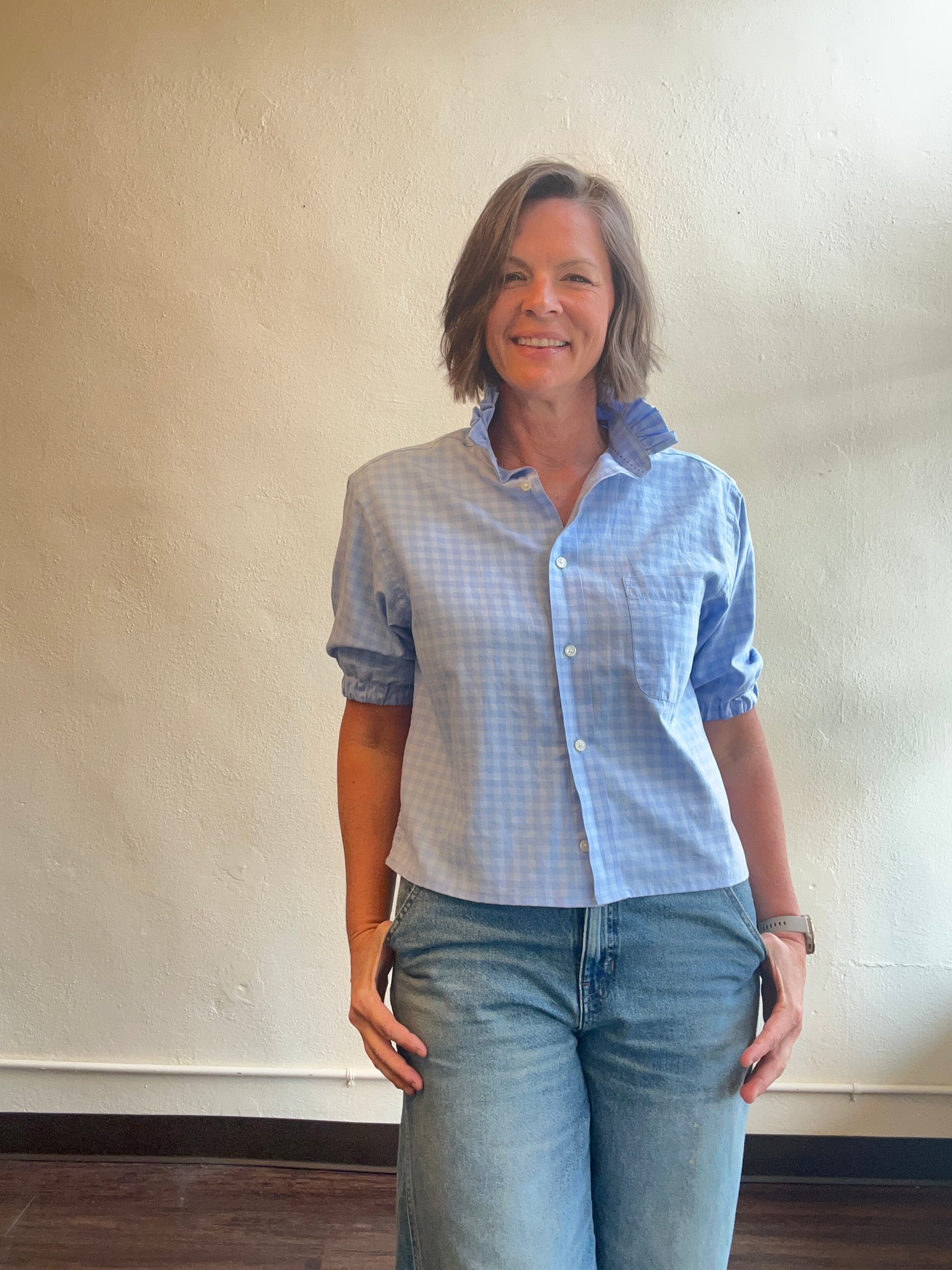 Tone on tone gingham, cropped button up with custom ruffle collar and gathered sleeves