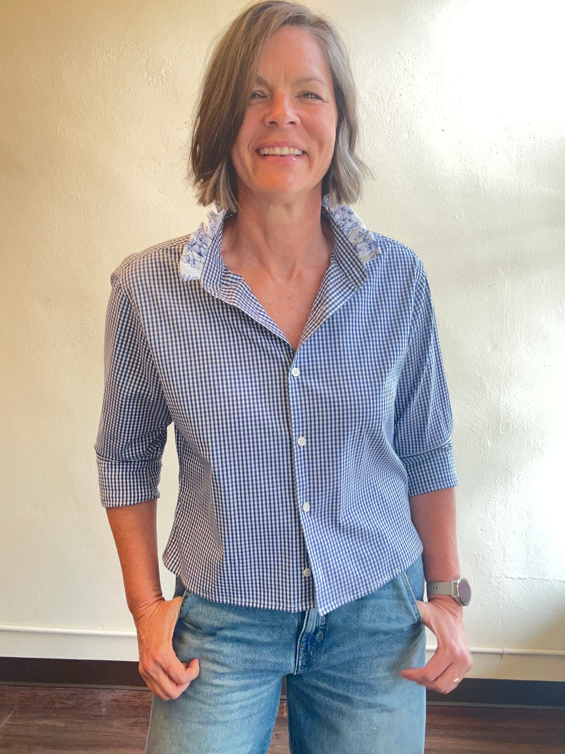 Classic navy gingham, cropped button up with custom vintage style floral ruffle